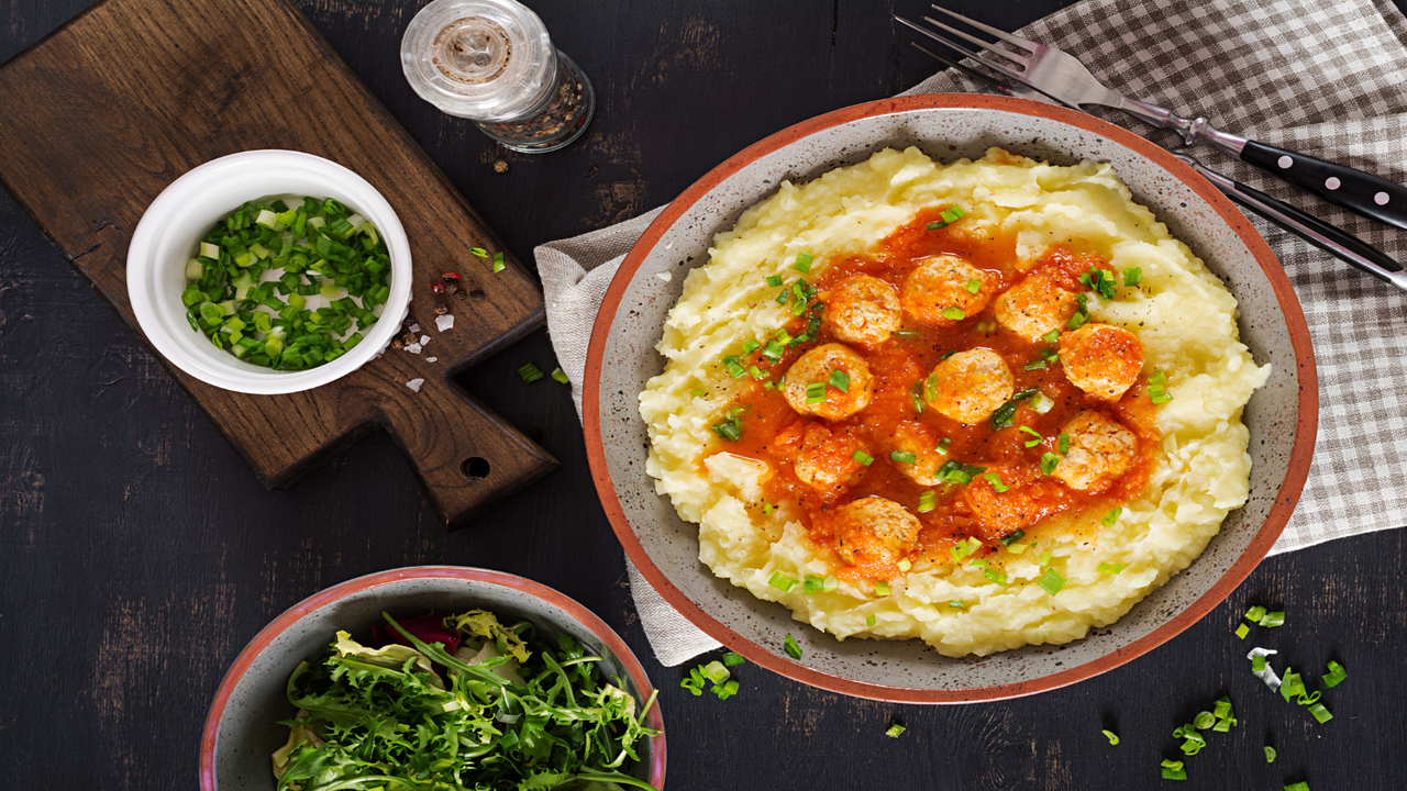 Escolha uma carne moída com um pouco de gordura para garantir almôndegas mais suculentas. O molho de tomate pode ser caseiro ou industrializado, mas prefira um com menos acidez. O purê deve ser feito com batatas tipo Asterix (rosadas), que deixam a textura mais firme e cremosa.