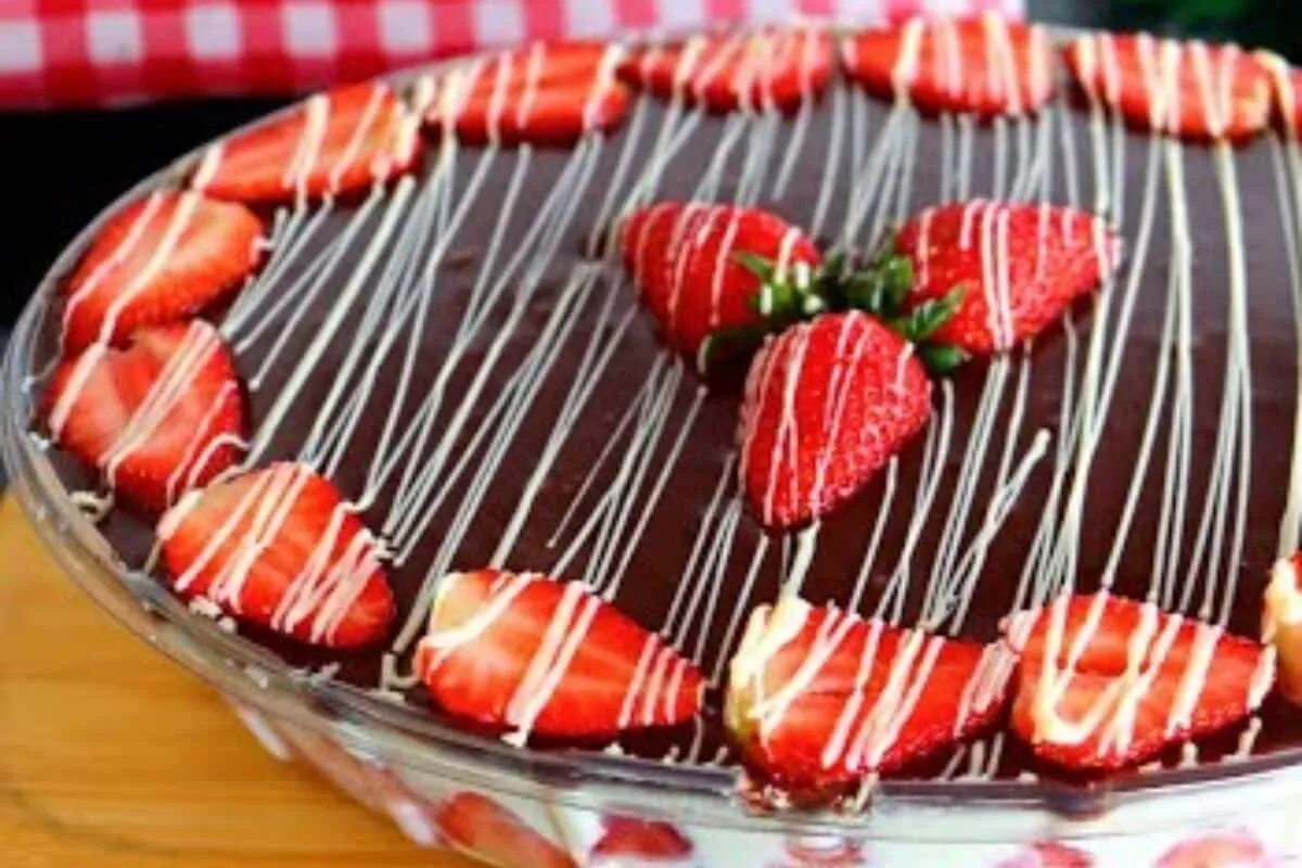 - Retire da geladeira, derrame todo o ganache por cima do creme na travessa que estava na geladeira e decore com pedaços de morangos cortados em filetes e no centro com morangos inteiros.