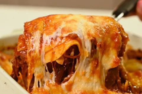 - E então, retire do forno e se surpreenda com tanta suculência que é essa lasanha de fraldinha desfiada que é de comer rezando!