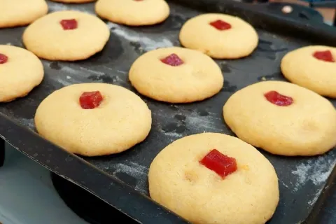 - Finalize colocando um pedacinho de goiabada por cima de cada bolinha e leve ao forno pré-aquecido a 180ºC por aproximadamente 20 minutos.