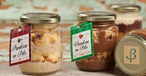 - Faça camadas em um pote de vidro, colocando um pedaço de chocotone e outra camada de brigadeiro. Faça isso até encher o pote de vidro.