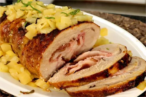 Lombo assado recheado com calda de abacaxi um prato maravilhoso para servir nesse natal