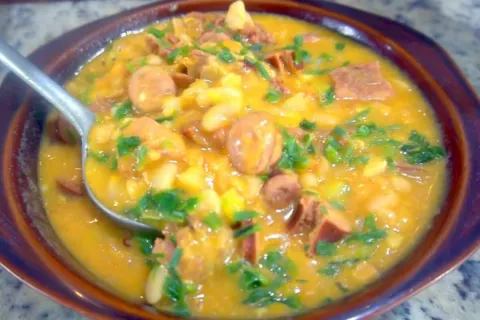- Inclua 1 linguiça calabresa fininha ou normal em rodelas, 5 dentes de alho picados grosseiramente, 1 cebola pequena picada grosseiramente, 1 cenoura picadinha e 3 folhas de louro, misturando para fritar tudo.