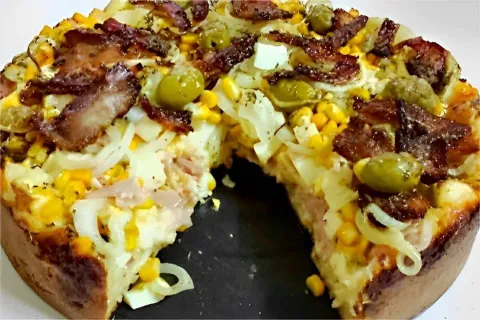 Para a receita de torta portuguesa, vamos iniciar pela massa, com os seguintes ingredientes: ovos, leite, óleo, farinha de trigo, caldo de carne ou de galinha, queijo parmesão ralado e fermento em pó. O preparo é bastante simples, basta bater os ingredientes no liquidificador e por fim, colocar o fermento em pó, misturando, então vamos transferir a massa para uma forma redonda. Na sequência, vamos cobrir a massa com o recheio, nessa ordem: muçarela, presunto, milho, ovos cozidos, cebola, bacon e por último azeitonas. Vamos assar em forno pré-aquecido por uns 30 minutos, até dourar. Iremos retirar do forno e deixar amornar. Sirva sua espetacular torta portuguesa e aproveite essa maravilha, bom apetite!