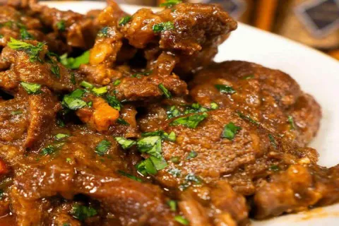 - Depois desse tempo, desligue o fogo, deixe a pressão sair naturalmente, abra a panela, caso a carne esteja macia, retire e disponha numa travessa para servir.